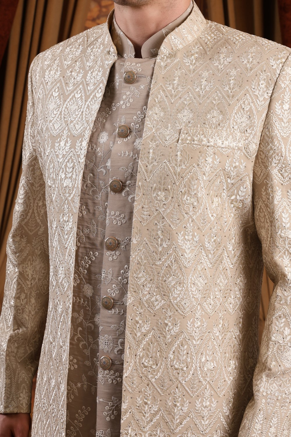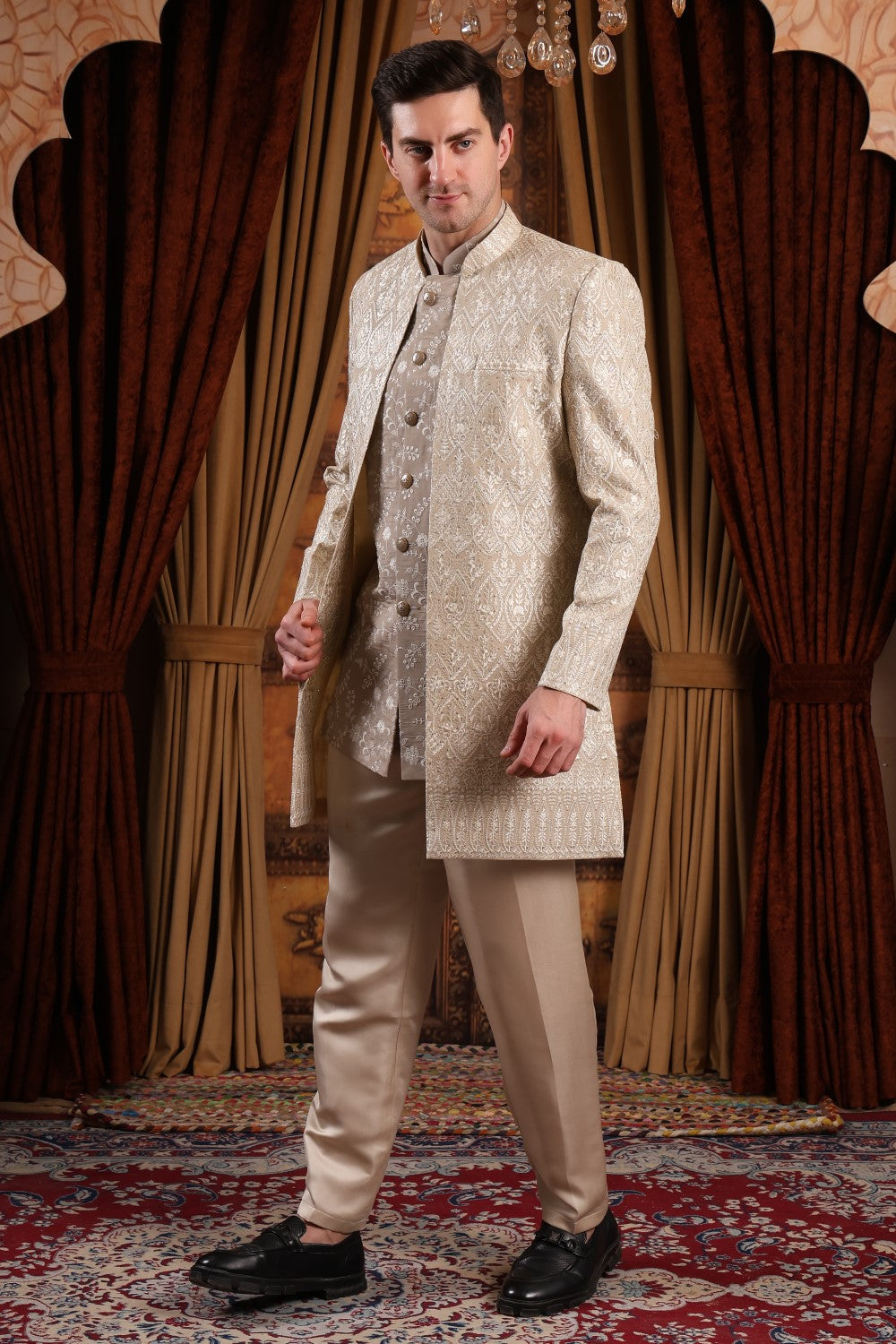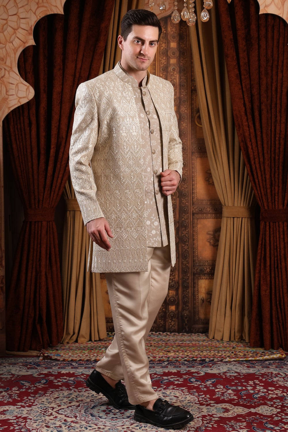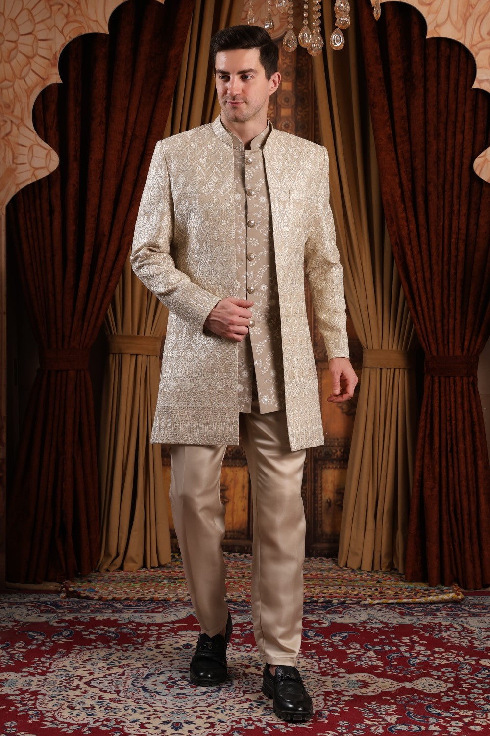 Refined champagne gold Indo-Western with intricate embroidery and layered detailing. Perfect for grooms, weddings, and receptions, offering a graceful blend of heritage craftsmanship and modern sophistication.