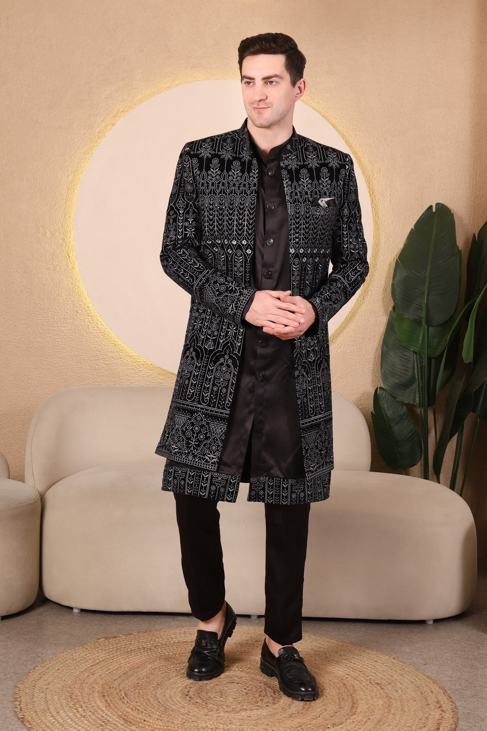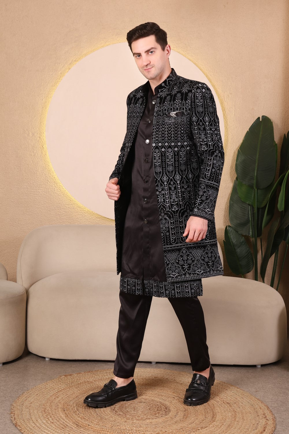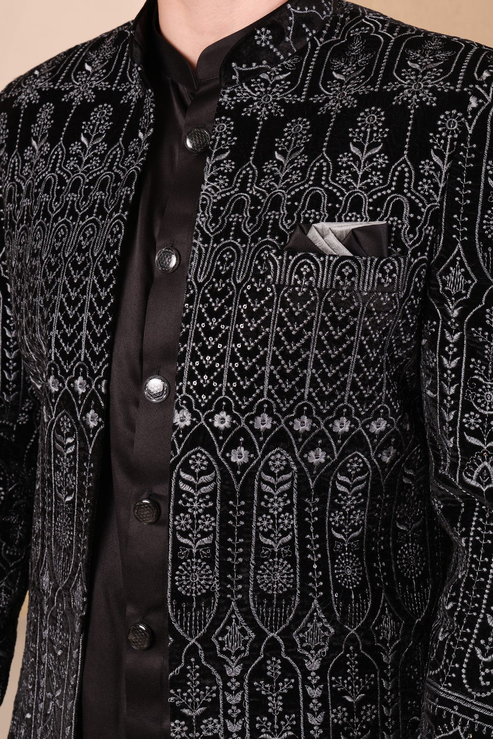 Midnight black velvet embroidered Indo-Western sherwani set featuring intricate tonal detailing, satin kurta, and tailored trousers. Perfect for weddings, receptions, and festive occasions with a modern regal appeal.