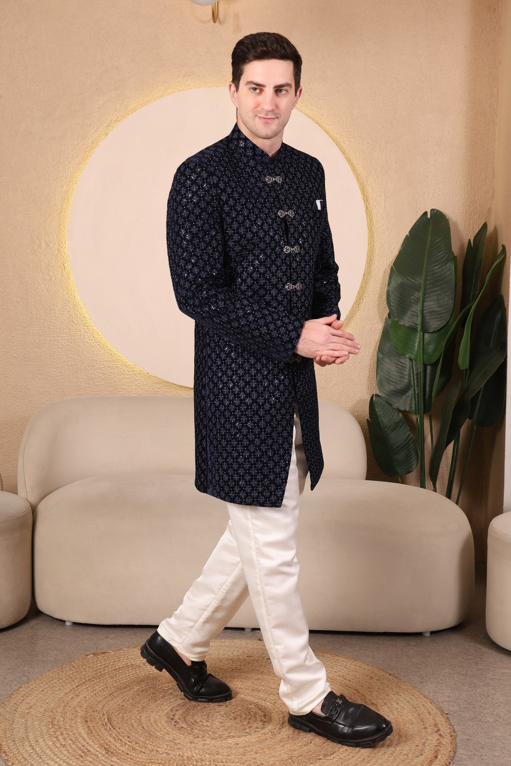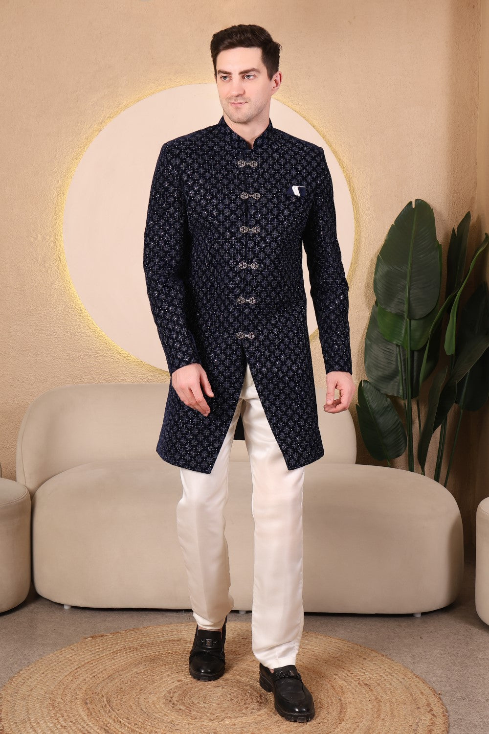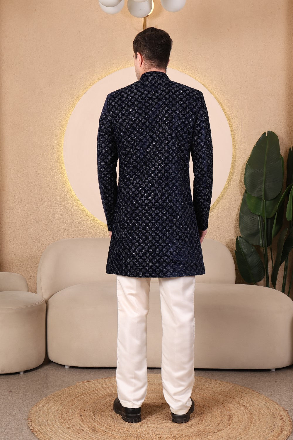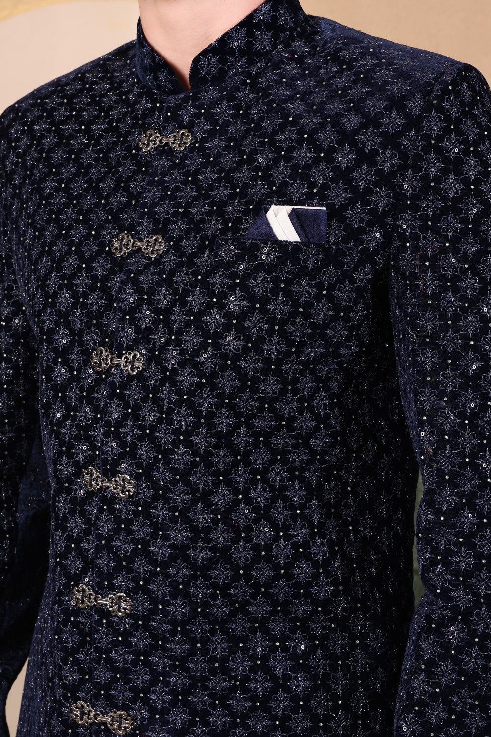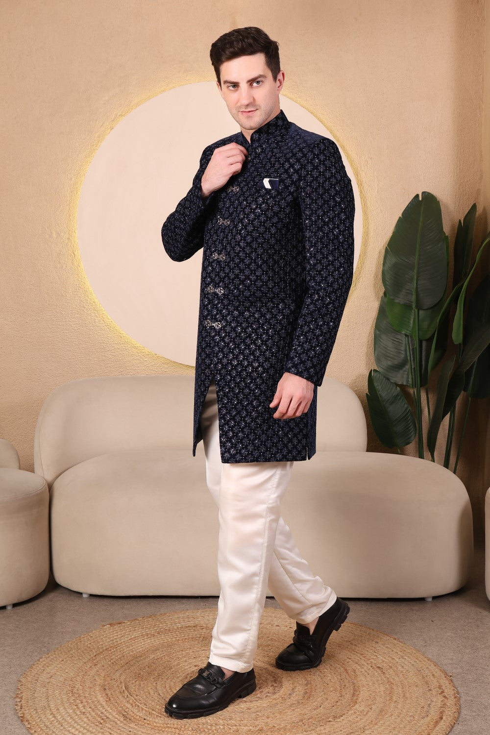 Rich midnight blue velvet Indo-western set featuring intricate embroidery, statement buttons, and tailored ivory trousers. Perfect for weddings, receptions, and refined evening celebrations