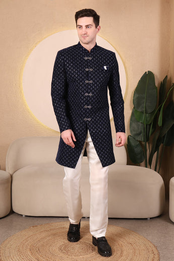 Midnight Blue Embroidered Velvet Indo-Western Set