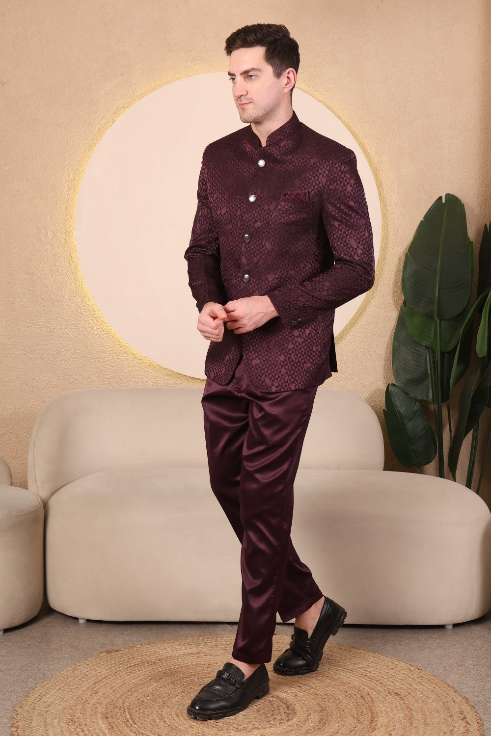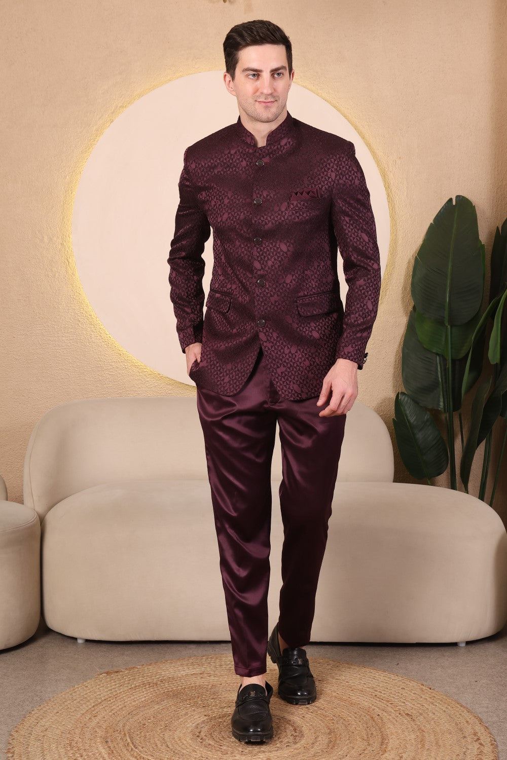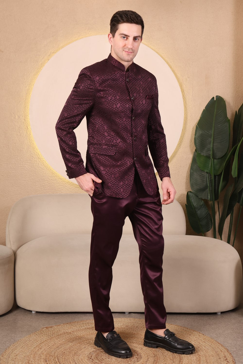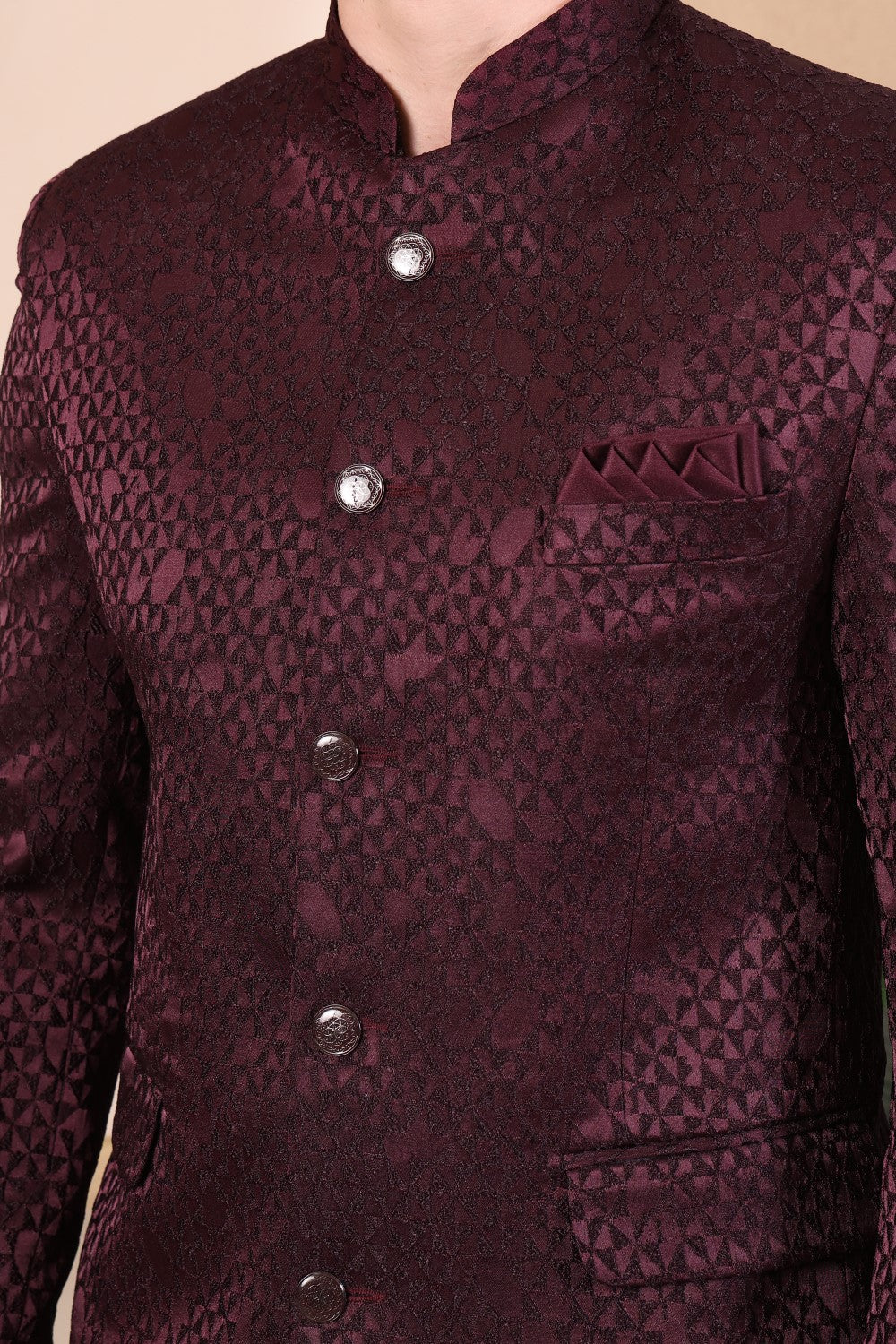 Command the room in this velvet Bandhgala. Artfully detailed with gold floral embroidery, it blends traditional Indian heritage with a sharp, modern silhouette for the discerning gentleman.