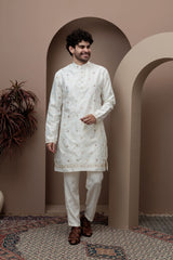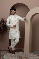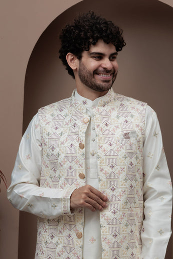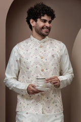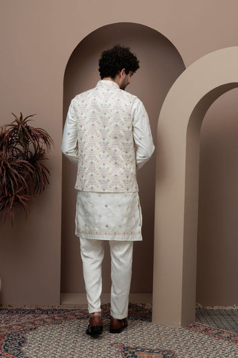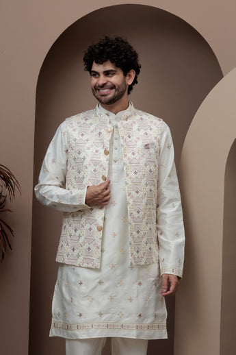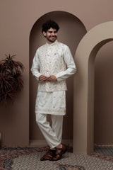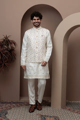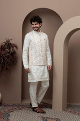 Crafted for comfort, this white kurta pajama jacket is made to suit warm-weather occasions and traditional events.